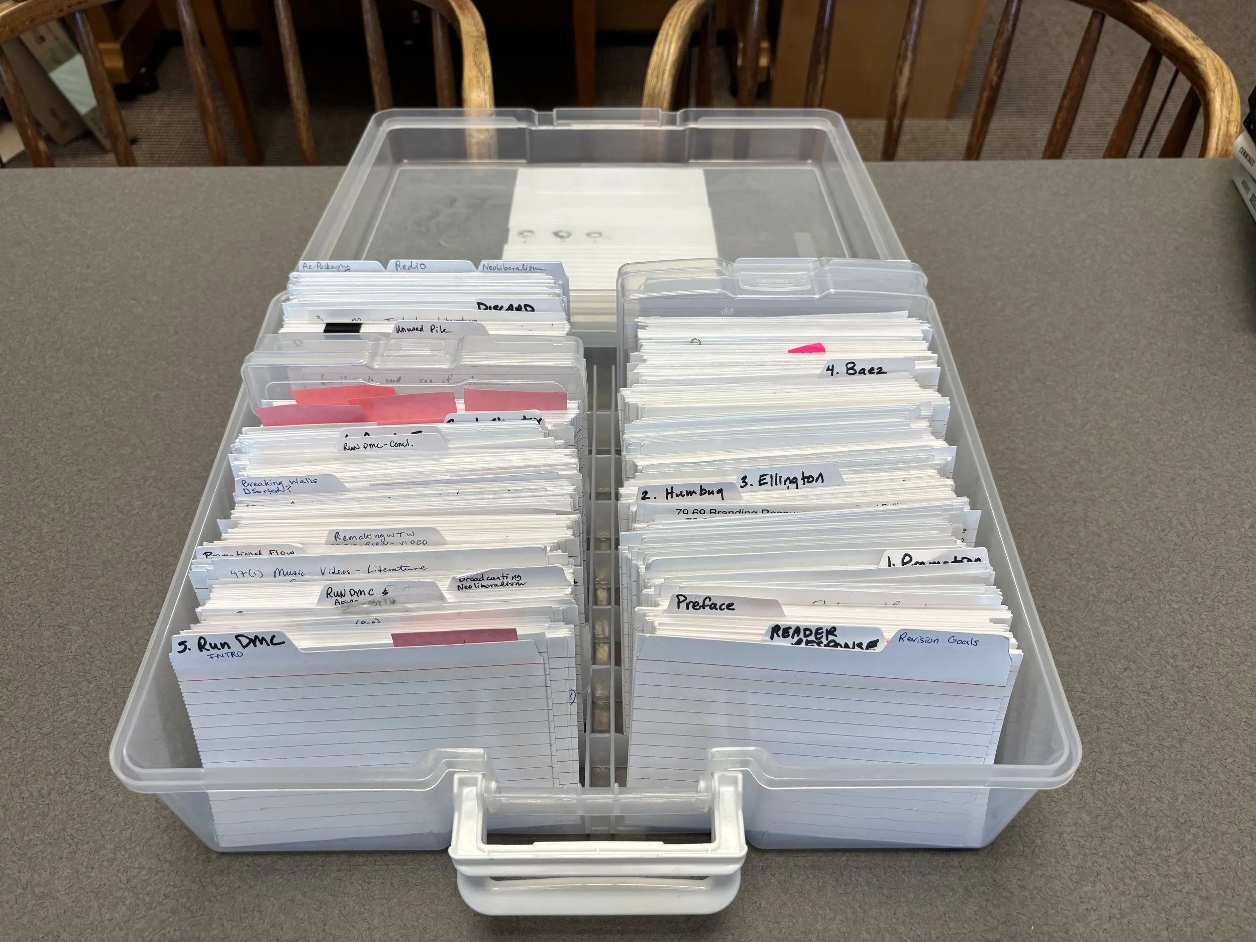 As a part of my research practice, I use 4x6 lined note cards to capture thoughts, information, quotes, ideas, connections, and other elements related to a topic or argument I’m working on. It’s a modified version of the index card method that I learned in 4th grade.